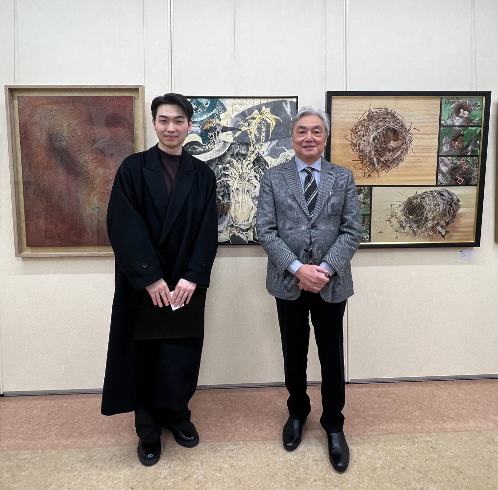 The award ceremony for Japanese Painting 2024 was taken place in Tokyo. In the center is Grand Prize winner Li Dan with his work "Tsuchi wo ayumu hibi (days of walking on the earth)", on the right is the Honorable Prize winner Tanaka Motoyuki's work "Inochi no yurikago (the cradle of Life)", and on the left is the Honorable Prize winner Weihong's work "Sanka (brilliant blossoms)".